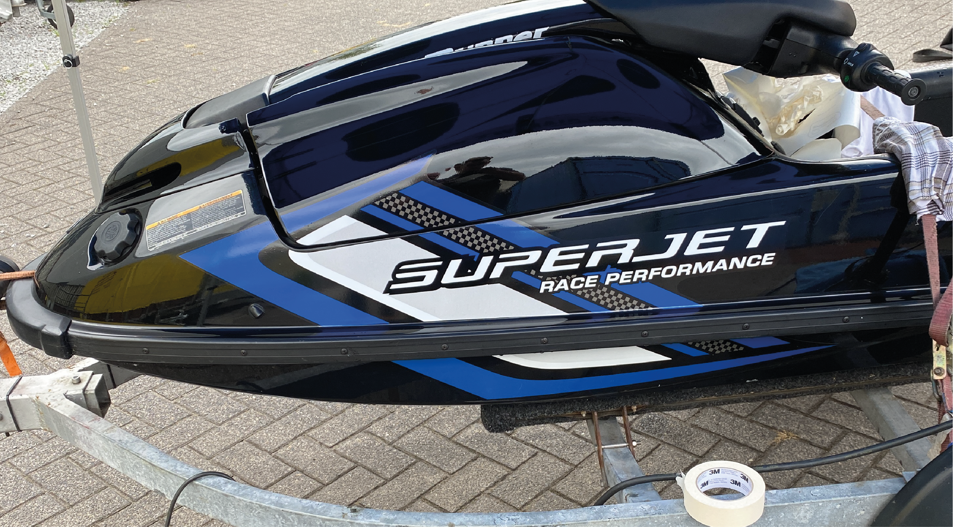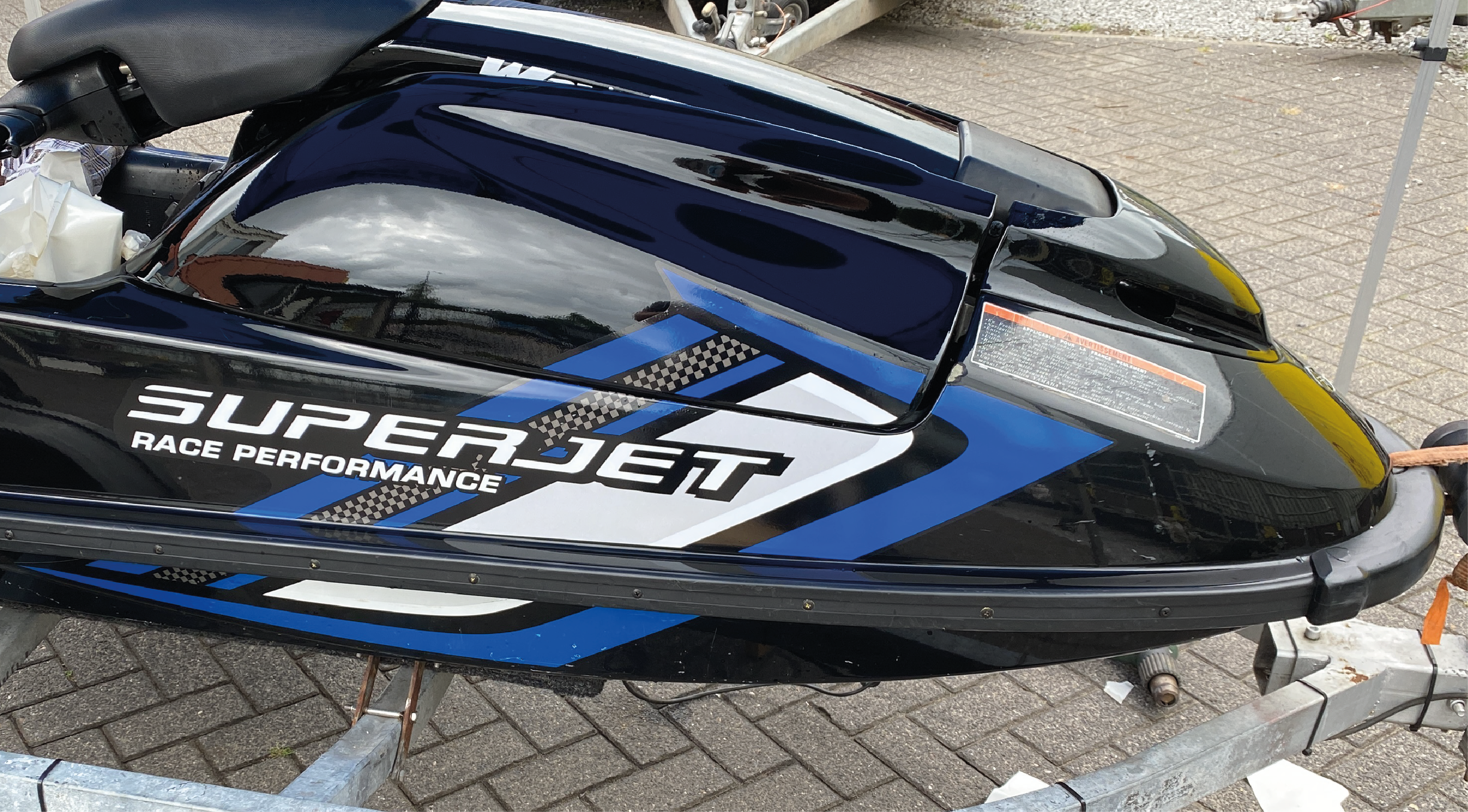 Wij hebben deze Yamaha superjet 700 jetski mogen voorzien van een original look stickerset met de door ons ontworpen en full color geprinte folie.